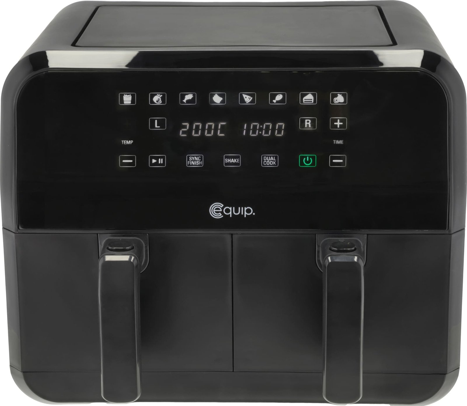 Equip Dual airfryeren 34761 på 1.700 W har en kapacitet på 8 l og kommer med 8 forudindstillede programmer til stegning, ristning, grillning og bagning. Airfryeren har to kurve på 4 l til samtidig tilberedning og en LED-touchskærm.