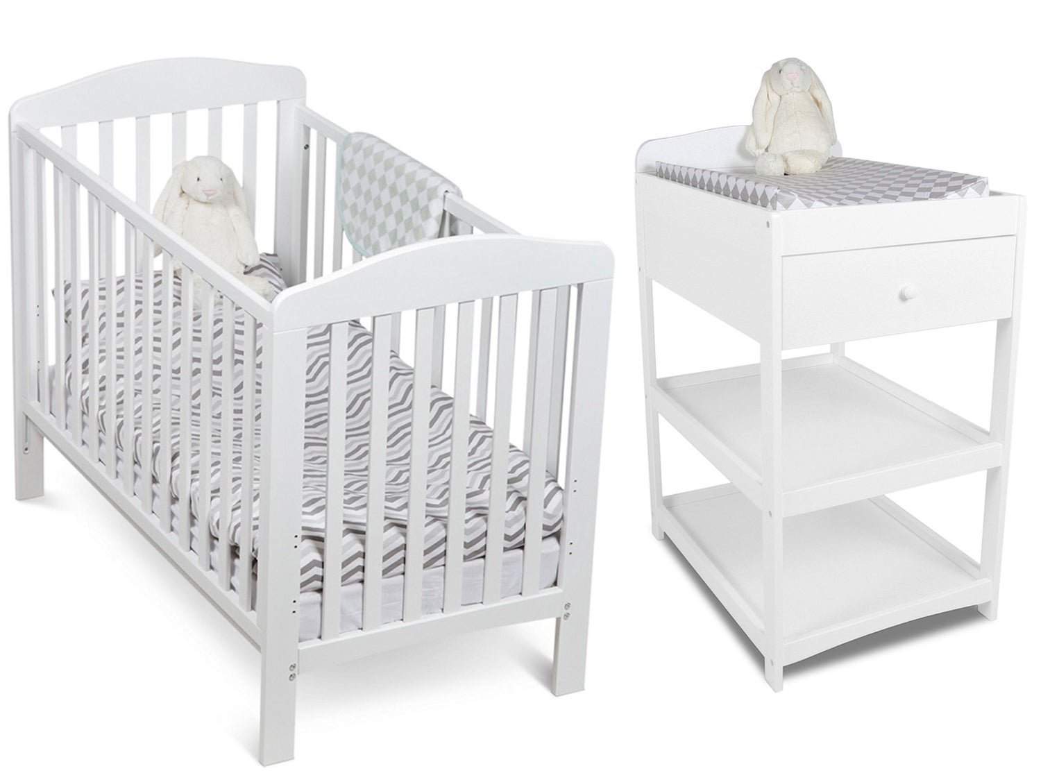 En fin og praktisk pakke med både puslebord og babyseng fra JLY til nybagte forældre. Begge møbler er fremstillet i hvidmalet træ og giver et lækkert, lyst udtryk til rummet.