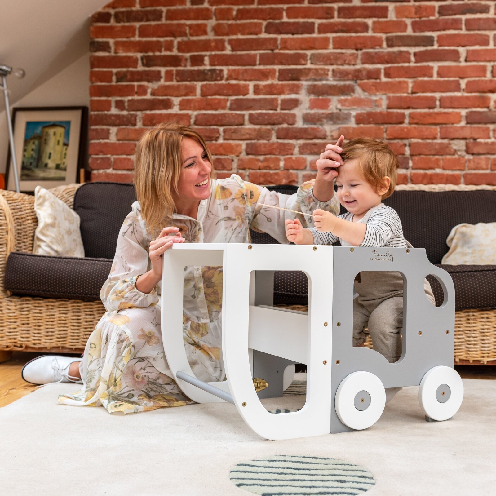 Montessori køkkentrappe: bord, stol og trappe i ét Denne montessori-inspirerede køkkentrapper, der nemt kan omdannes til bord og stol, er designet og skabt til læring, madlavning, klatring, siddeplads ved det store familiarbord samt spisning eller bare le